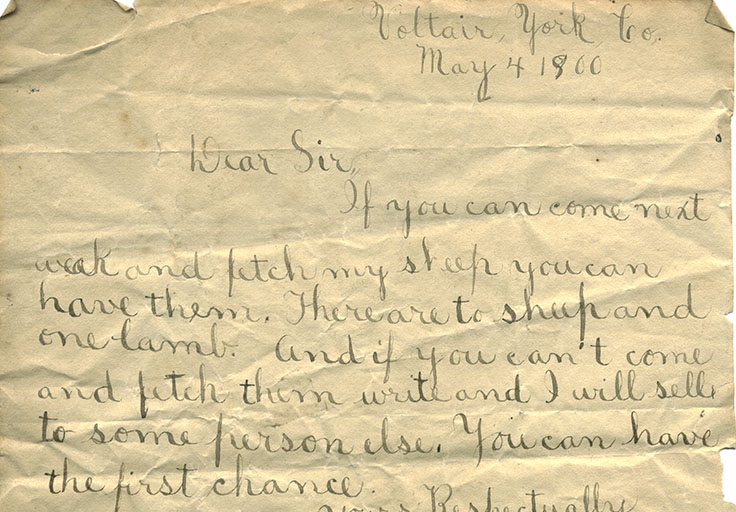If you can come next weak and fetch my sheep you can have them. There are to sheep and one lamb. And if you can't come and fetch them write and I will sell to some person else. You can have the first chance.