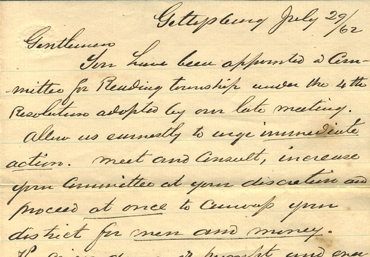 The crisis demands prompt and energetic action. The people do not comprehend the danger - our army must be re-inforced speedily and the rebellion put down, or it will put us down. When all is at stake, let us not hesitate to make sacrifices - let not Adams County fail to meet the [unknown] of duty.