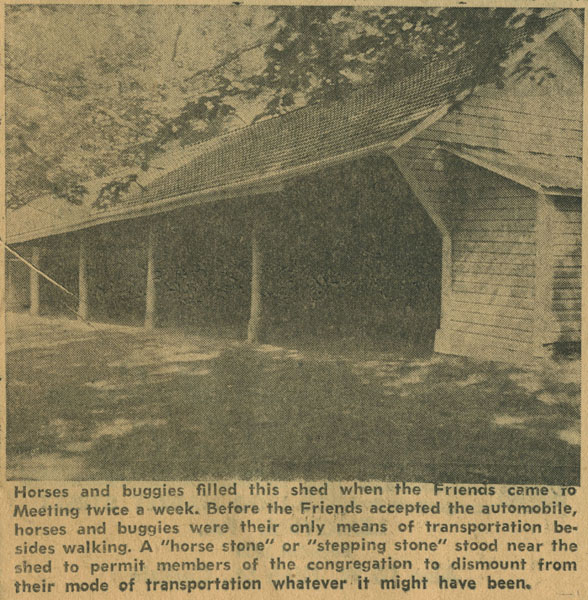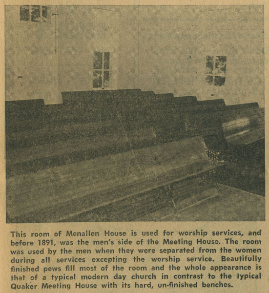 "Like all the older Quaker places of Worship, it (the Meeting House) is divisible into two sections by means of a partition that can be raised or lowered. After the Meeting for Worship, the men would lower the partition and the business would be considered.
