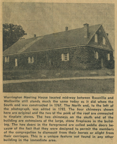 Warrington Meeting House, located midway between the towns of Wellsville and Rossville in Warrington Township, was officially established in 1745. The previously mentioned log structure was erected at this time on a tract of 29 acres and 156 perches. According to early records the land was located "near the land of Stephen Aliles on a branch of Conewago Creek."