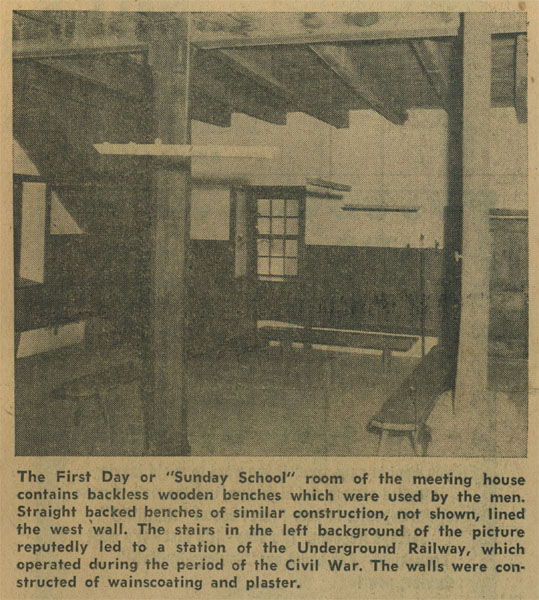 Reputedly the attic of Warrington Meeting House was a station of the Underground Railway. During the time of the Civil War, Northerners who were sympathetic with Southern negroes established a long chain of hiding places stretching from the deep South and continuing to the Canadian border. The Quakers played a great part in the "underground railway". Slaves traveled mostly by night assisted by the Quakers or other aids. During the day they were hidden in secret quarters or stations where they obtained food and rest.
