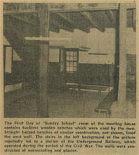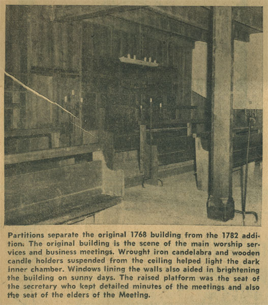 Natural light is admitted to the building through small windows located 'round the room. Entrance is gained to the original building through doors located on the north, south, and west sides. The unique feature of the west side doors is that they are located 24 inches above the ground to permit members of the congregation to dismount from their horses or alight from their carriages and enter the building directly without coming in contact with the ground. This feature eliminated the stone step arrangement which was mentioned in the last article as being used at Newberry Meeting.