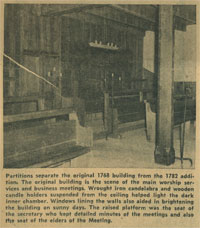Music for the little singing that was done in meetings was provided by a small organ located at the rear of the pews in the center of the room. The organ still plays and is used for the annual Warrington Meeting.
