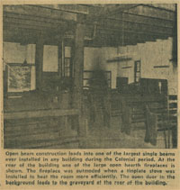The main beam in the original building was 48 feet long, a considerable length for construction work of the day. It was hand hewn and chamfered along its edges. Also of interest is the fact that all of the hardware throughout the building is an example of hand craftsmanship.