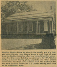 "No longer can be seen the plain bonnet and the broad brimmed hat of former times. No longer is 'plain speech' mandatory. Surviving with a few in affectionate remembrance, the 'thee and thou' of older days is fast disappearing. Our young men are no longer subject to discipline or disownment for military service. In the present century, Menallen's boys have answered their country's call with no change in meeting status.