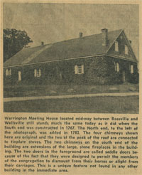 The second outpost established after crossing the Susquehanna was Warrington Meeting. The first meeting house was a log structure which stood a little south-east of the present stone building on a part of the tract of land that has since been enclosed in the graveyard. The foundations were discovered in the late 1880's' by men digging in the graveyard.